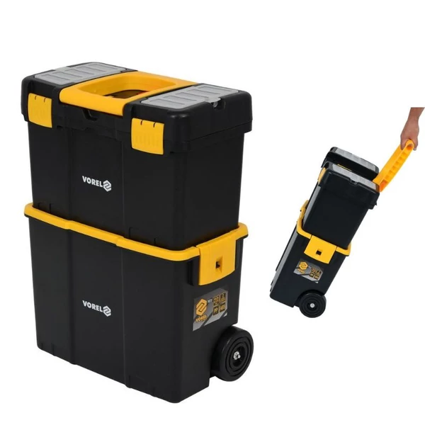 Kompakt, kényelmesen mozgatható, két részből álló szerszámos kocsi praktikus, levehető tetőszervezővel. Tartós, ütésálló műanyagból készült, robusztus csatokkal a véletlen kinyílás ellen — ideális házi- és hobbi-műhelyekbe, karbantartáshoz, kisebb szerelésekhez.