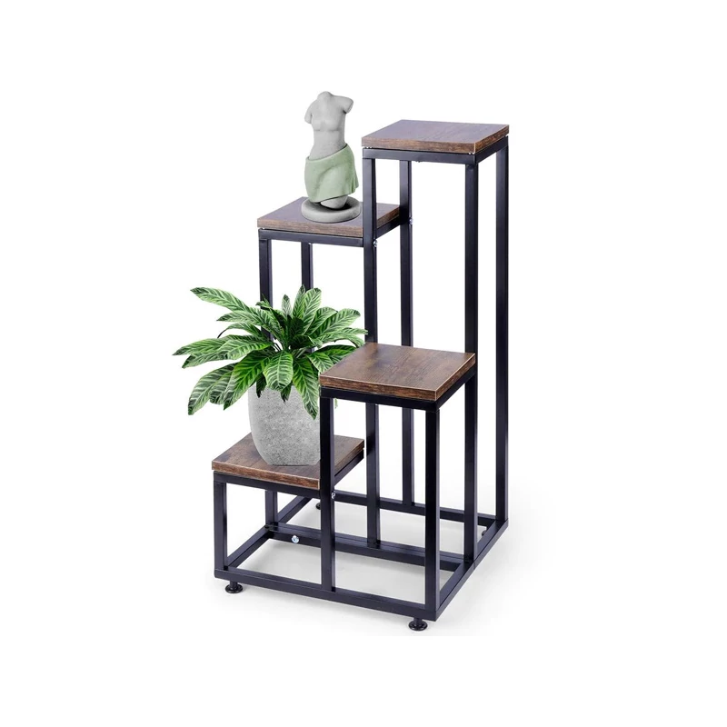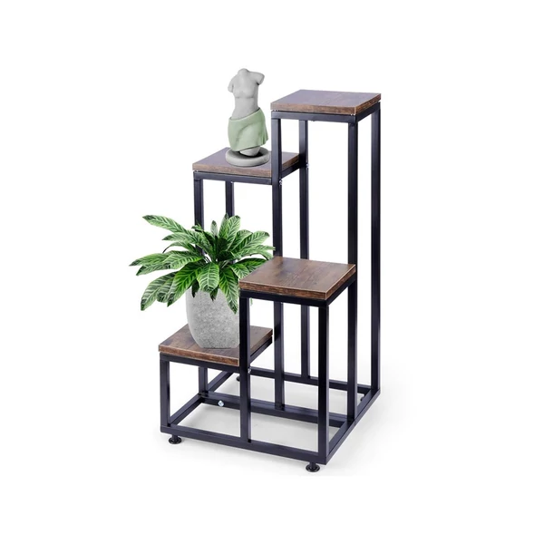 Ez a stílusos és funkcionális virágtartó állvány ideális megoldás, ha szeretné bemutatni a növényeit, szobadíszeit vagy egyéb dekorációs elemeit. A lépcsőzetes elrendezés elegáns és helytakarékos megoldást kínál, miközben egyediséget ad a térnek. A fém és fa kombinációja modern, ipari hangulatot kölcsönöz a lakásnak.