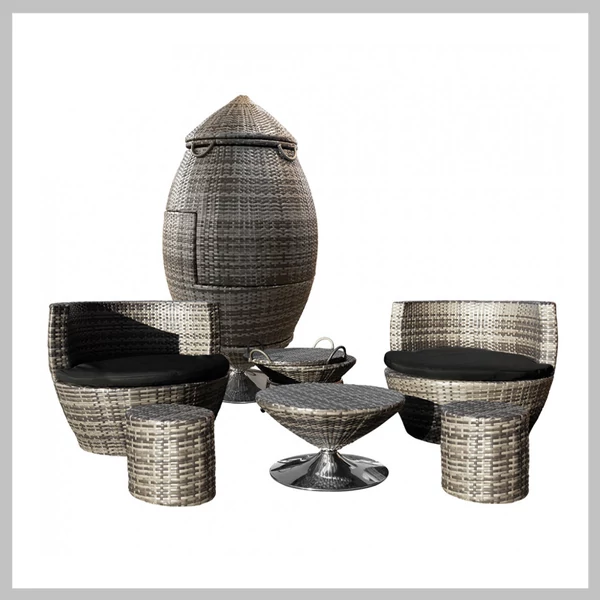 Ez a tetszetős kerti bútorkészlet időjárásálló polirattanból porszórt fém támasztékokkal kombinálva bel- és kültéren egyaránt használható. 2 kényelmes fotelből, hozzáillő ülőpárnákkal, 2 lábzsámolyból, 2 kisasztalból és egy tálcából áll. Szükség esetén minden alkatrész gyorsan és egyszerűen összeszerelhető bútortojásba a helytakarékosság érdekében.