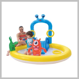 Vízkapacitás: 175 liter, strapabíró és korábban tesztelt vinilből, permetező fúvókákkal - amit a kerti tömlőhöz kell csatlakoztatni, mérete: 178x171x121cm több funkcióval: fröccsenő szörny, csúszda,