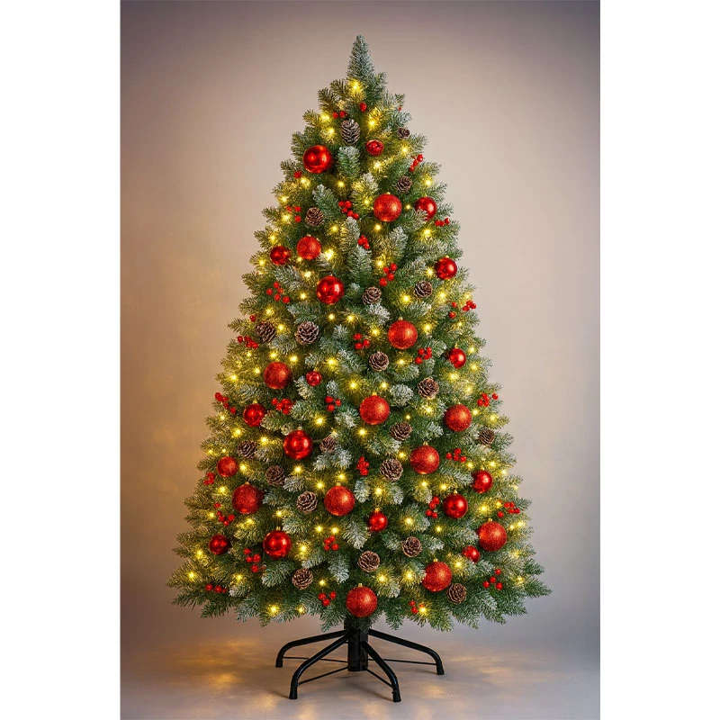 Stílusos és elegáns karácsonyi műfenyő, amely természetes hatásával varázsol ünnepi hangulatot otthonába. A hóval borított ágak, a dekoratív tobozok és piros bogyók különleges, téli megjelenést biztosítanak, így a fa önmagában is ünnepi dekoráció, de fényfüzérekkel és díszekkel tovább szépíthető.