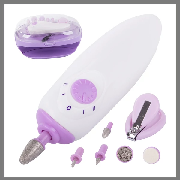 Ezzel a készlettel könnyedén gondoskodhatsz a körmeid megjelenéséről. Egyengetheted a körmeidet, eltávolíthatod a körömlakk maradványait és simíthatod a körömlemez felületét. Az eszköz nagyon csendes működésű, és ergonomikus alakja van, amely illeszkedik a kezedhez. Az 5 cserélhető hegy mellett egy kis körömcsipesz is szerepel a készletben. A gépnek két sebességfoka van mindkét forgásirányban. Az eszköztartó, amelyben a vágó található, egyben körömszárító is, így két eszköz egyben. A manikűr után azonnal megszáríthatod a körmeidet. A készülék működéséhez csak tedd be a kezed a szárítóba, majd nyomd meg az alsó gombot.