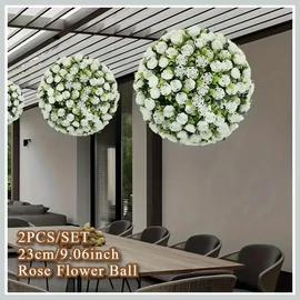 Varázsolj romantikus, virágos hangulatot kertedbe, teraszodra vagy rendezvényed helyszínére ezzel a 2 darabos rózsagömb dekorációval! A gömbök valósághű, fehér selyemrózsákból és zöld levelekből készültek, átmérőjük 23 cm