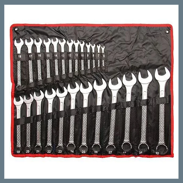 25 db-os kombinált kulcskészlet, egy praktikus összehajtható tartóban.