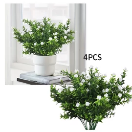 4 darabos szett – Négy művirág csokor, mindegyik fehér virágokkal és zöld levelekkel.
