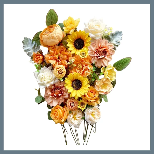 Ez a gyönyörű, természetes hatású művirágcsokor doboz napraforgókkal, rózsákkal és vegyes selyemvirágokkal tökéletes választás minden szezonban. Élénk sárga, narancssárga és krémszínű árnyalatai melegséget és vidámságot visznek bármilyen térbe, legyen szó esküvőről, dekorációról vagy kreatív kézműves projektről.