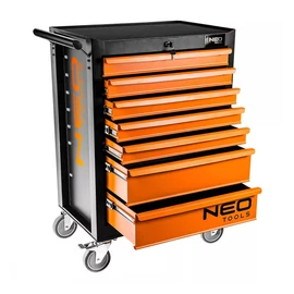 NEO szerszámosláda, mérete 680 x 460 x 1030 mm. A szekrénynek 6 praktikus, központi zárral felszerelt szerszámfiókja van. Mindegyik fiók teljes kihúzású, sokéves, csendes futású, zavarmentes működést garantáló golyós sínen mozog. A fiókok kihúzásgátlóval vannak felszerelve, ami védelmet biztosít szállítás közben. A munkalap olajoknak, zsíroknak ellenálló gumiszőnyeggel borított. Csendes, 5–colos, elforgó, fékes kerekek könnyítik meg a mozgatást. A szekrény terhelhetősége 280 kg. A szekrény fogantyúja megkönnyíti mozgatását.