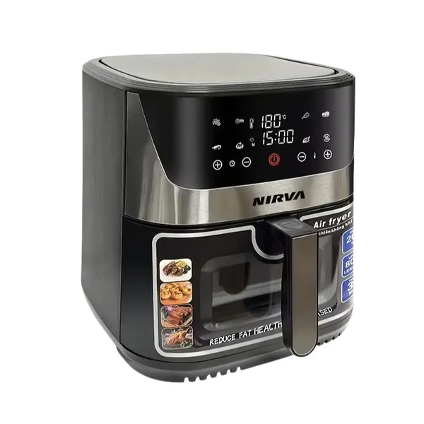 A NIRVA 10 literes, európai szabványú érintőképernyős légkeveréses sütő ideális választás nagyobb családok számára. A modern digitális vezérlés egy gombnyomással kínál előre beállított programokat sültkrumpli, baromfi, húsok és halak elkészítéséhez.