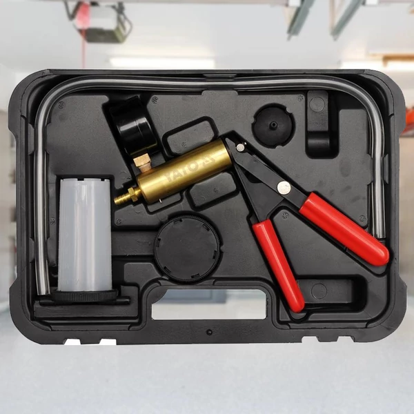 A készlet 16 részből áll, nevezetesen egy manuális szivattyúból, nyomásmérővel, amely akár -1 bar vákuummal működik, egy folyadéktartályt, tömlőket és egyéb összekötő elemeket.