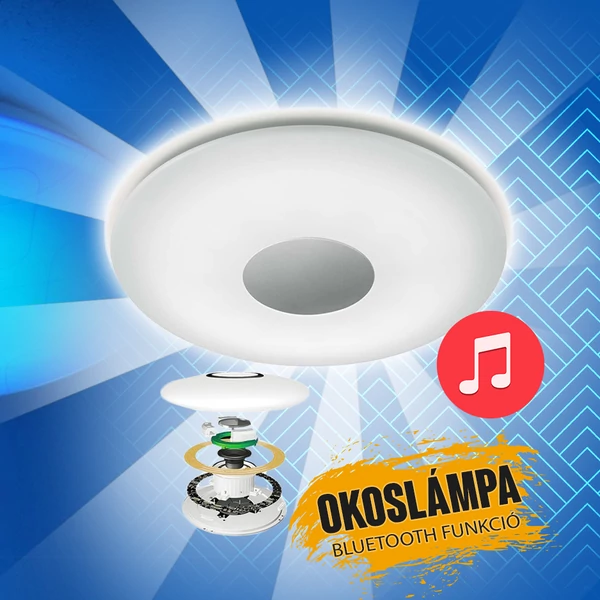 Legyen Öné ez a kiváló minőségű okos mennyezeti lámpa amivel nem csak otthon világítását, és annak hangulatát határozhatja meg hanem akár zenét is hallgathat, valamint a lámpa képes a zene ritmust is érzékelni, ezáltal pulázáló, villogó fényeket kiadni, akár egy diszkóban. A mobil készülékkel bluetoothon és wifin keresztül is csatlakozni lehet a lámpához. Környezetbarát és energiatakarékos a benne található ledeknek köszönhetően.