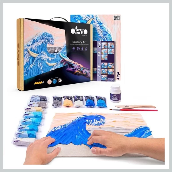 Az ОКТО kreatív 3D szett "Sensory Art - Waves of Kanawaga" azoknak a felnőtteknek készült, akik szeretnének egy kis időt magukra találni a nyüzsgő világban. Ez a 3D modellező készlet lehetővé teszi, hogy ujjai érintésével elkészítse a remekmű saját verzióját az óceán hullámainak motívumával és a pezsgő tengeri világgal. A készlet mindent tartalmaz, ami egy kép elkészítéséhez szükséges - természetes vászon, instrukciók, fa modellező eszköz és festékszóró készlet. Egyedülálló önkeményedő vegyület, amely nem tapad a kézre és nem hagy nyomot, könnyen felvihető és harmonikus átmeneteket hoz létre a színek keverésekor. Lehetővé teszi a hullámok mozgásának átvitelét a képbe. Érezd a vászon textúráját az ujjaid alatt, és hagyd, hogy kreativitásod uralkodjon el, miközben óceáni tájat modellez. A készlet tartalmaz légagyagot, professzionálisan kifeszített, használatra kész vásznat és egy faszerszámot. A kész festmény, miután megszáradt, eredeti és dinamikus kiegészítője lesz otthona belső terének, tükrözi személyes kreativitását, és lehetővé teszi, hogy otthon egy darab tengert alkosson.