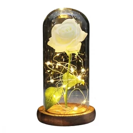 Ez az elegáns és romantikus dekoráció tökéletes ajándék különleges alkalmakra. A kristályhatású örökrózsa átlátszó üveg búra alatt helyezkedik el, körülötte LED fényfüzér biztosítja a varázslatos hangulatot.