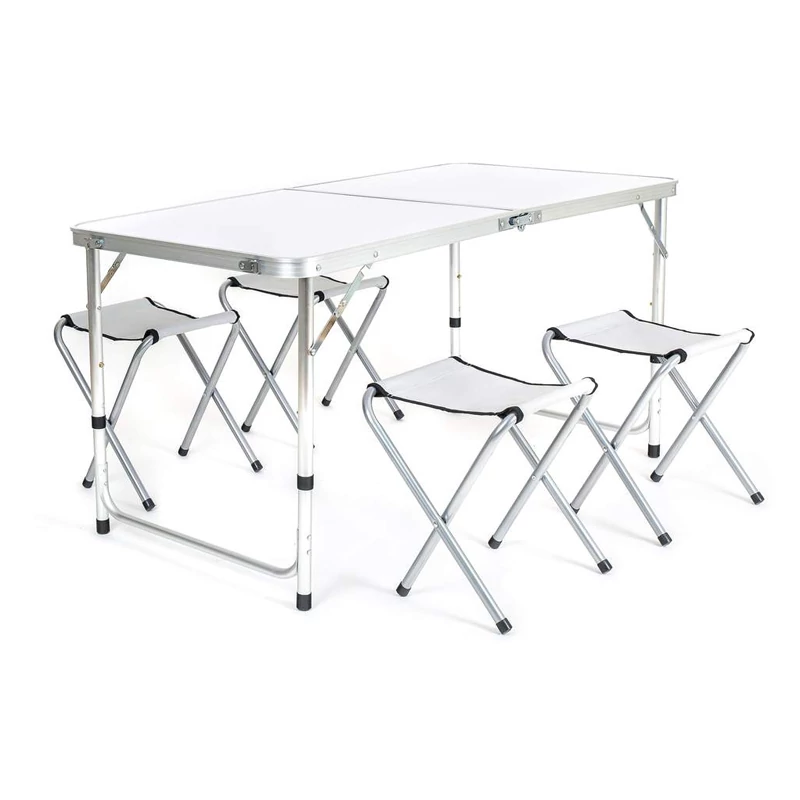 Ez a praktikus és könnyű összecsukható kempingasztal szett ideális választás szabadtéri programokhoz, piknikhez, kempingezéshez, horgászathoz vagy akár kerti használatra is. A szett egy stabil alumínium vázas asztalt és négy könnyen összecsukható széket tartalmaz, amelyek kis helyen is elférnek, könnyen szállíthatók és gyorsan felállíthatók.