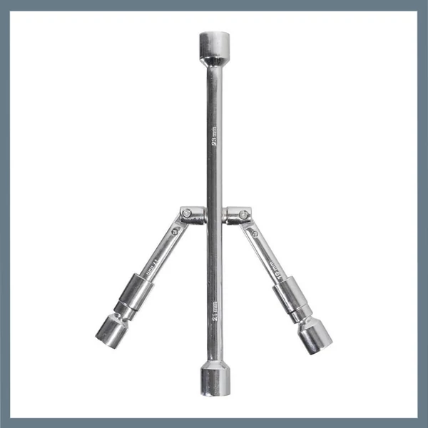 Masszív, teljesen fémből készült kereszt alakú összecsukható kerékkulcs, amely autók kerékanyáinak lazítására vagy meghúzására szolgál.