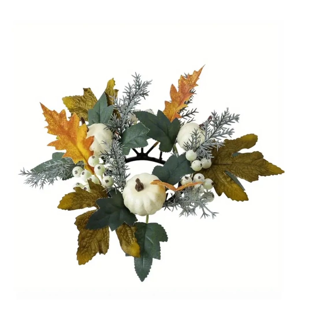 Stílusos őszi dekoráció, amely a természet színeit és formáit idézi meg. A gyertyakör díszítését fehér mini tökök, bogyók és különböző őszi levelek alkotják, kiegészítve zöld és ezüstös ágakkal. Letisztult, elegáns hangulatot teremt otthonodban.