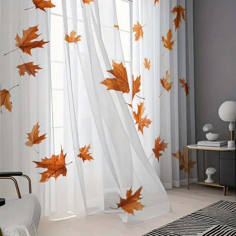 Ez a dekoratív fényáteresztő függöny természetes hangulatot kölcsönöz otthonának az őszi falevelek motívumaival. Könnyed, légies anyagból készült, amely szépen engedi be a fényt, miközben elegánsan díszíti az ablakot.