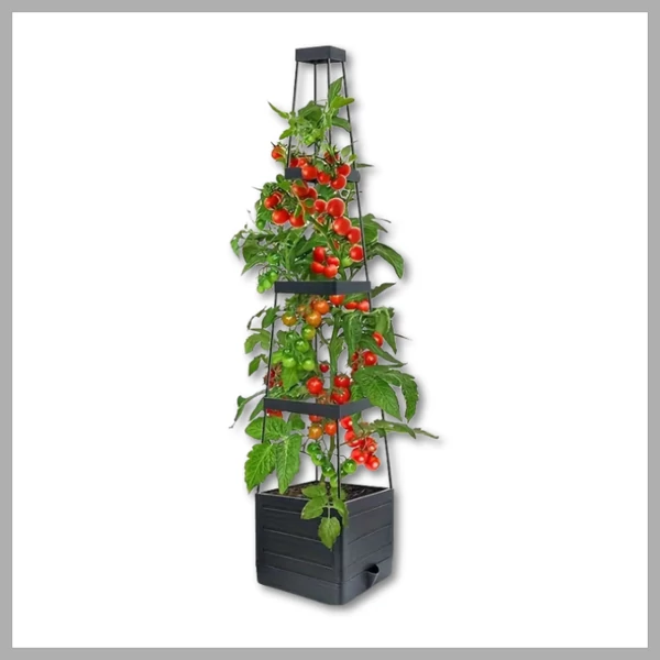 Növelje kertje produktivitását és rendezettségét ezzel a praktikus, kompakt paradicsomtoronnyal! A beépített öntöződoboz és a fokozatosan szűkülő fémrács ideális paradicsom, uborka, futóbab, vagy más mászónövények stabil támasztásához és egészséges növekedéséhez.
