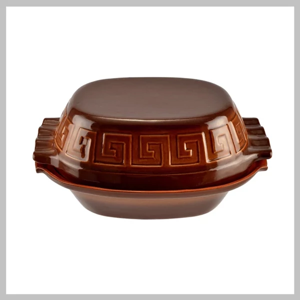 Használata: az edényt első alkalommal 30 percig, további sütések alkalmával 15-60 percig hideg vízben áztassa. Az edényt mindig hideg sütőbe, rácsra tegye, és fokozatosan melegítse a kívánt sütési hőmérsékletre. A forró edényt ne hűtse hirtelen, fa deszkára, hőálló alátétre vagy száraz ruhára helyezze!