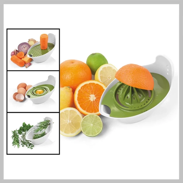 Tartalma: 1 db gyűjtőedény, 1 db citrusfacsaró / tojásszétválasztó, 1 db reszelő