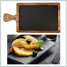 Akáciafa és pala tálaló deszka, amely használható steaktálként, gyümölcstálként, előétel kínálótálként, desszerttálként, sajttálként vagy salátatálként stb.