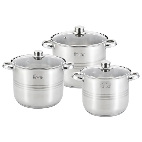 A Perfect Home rozsdamentes fazék szett három különböző méretű edényt tartalmaz, amelyek ideálisak nagyobb családi főzésekhez, befőzéshez vagy ünnepi ételkészítéshez. Az edények kiváló minőségű rozsdamentes acélból készültek, átlátszó üvegfedővel, amely lehetővé teszi a főzés folyamatos ellenőrzését.