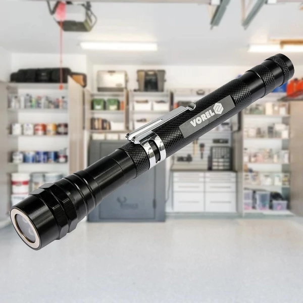 Teljesen fém teleszkópos LED-es zseblámpa, övcsipesszel és mágnessel. A zseblámpa a LED-ek helyén mágneses gyűrűvel van felszerelve, melynek köszönhetően a fémtárgyak (pl. csavarok) nehezen hozzáférhető helyeken is könnyedén kihúzhatók.A zseblámpa teleszkópos (56,5 cm-ig) és rugalmas nyakkal van felszerelve a könnyű fényállítás érdekében. 4x LR44 elemmel működik (tartozék).