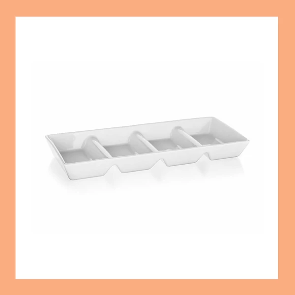 A BIANCA osztott porcelán tálalótál, fehér színben, hossza 33,7 cm, szélessége 13,7 cm, magassága 3,6 cm, tálalónak alkalmas. különféle mártogatós, dió, chips, gyümölcs vagy zöldség. Alkalmas mindennapi használatra. A tál alkalmas mosogatógépbe.
