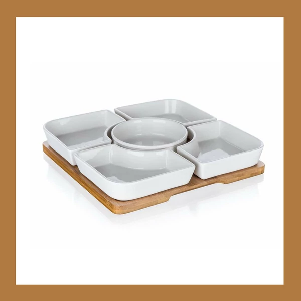 A 4 négyzet alakú és 1 kerek porcelán tálból álló készlet 24,5 x 24,5 x 4,5 cm teljes méretű, négyzet alakú bambusztálcán ideális különféle diófélék, szárított gyümölcsök, olajbogyók stb.