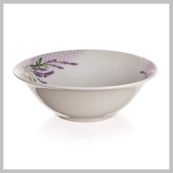 LEVENDULA tál 15 cm, anyaga - porcelán, fehér máz, levendula díszítéssel. A tál mikrohullámú sütőben használható és mosogatógépben mosható.