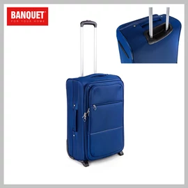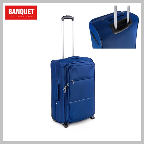 Utazási textilbőrönd 24'' kék színű, textilből készült, ami garantálja az alacsony csomagsúlyt. 2 kerékkel van felszerelve a csomagok könnyű mozgatása érdekében. A bőrönd 2 db textil fogantyúval (oldalsó és felül) és 1 db műanyag teleszkópos fogantyúval rendelkezik, behelyezés elleni zárral és több pozícióban állítható magassággal. A belső térben rögzítő pántokat és egy belső zsebet talál a holmijának jobb rögzítéséhez és rendszerezéséhez. Ezenkívül van egy külső zseb a kisebb tárgyak számára. A bőrönd cipzárral záródik. Az utazási poggyász teherbírása 18 kg.