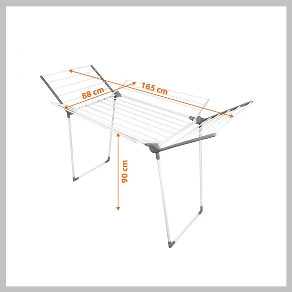 A széthajtott szárító méretei: magasság 90 cm, mélység 88 cm, szélesség 165 cm