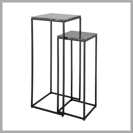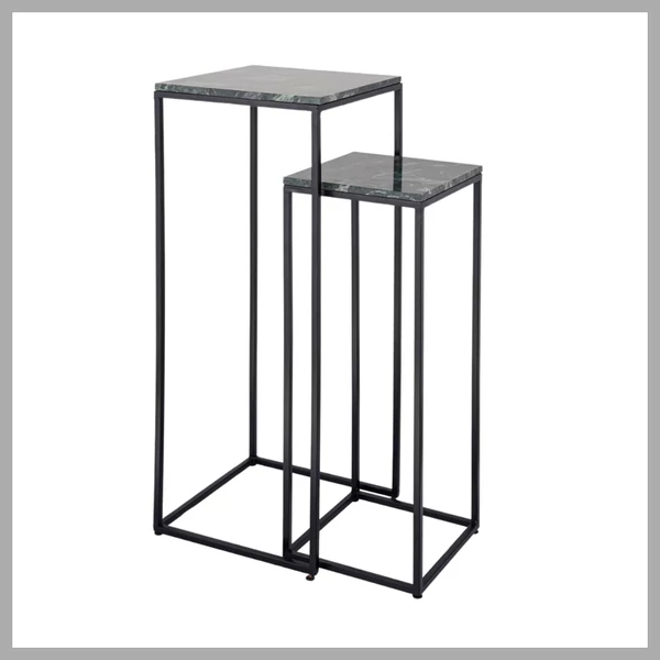 Ez az elegáns, két oldalsó asztalból álló készlet a stílusos zöld márványlapot erős vaskerettel ötvözi, fényűző és modern megjelenést kölcsönözve bármilyen belső térnek. A márványlap sima, egyenes szélű felülettel rendelkezik, ami minimalista és kifinomult megjelenést kölcsönöz az asztaloknak. A praktikus kialakításnak köszönhetően az asztalok a kívánt stílustól függően egyben vagy külön is elhelyezhetők.