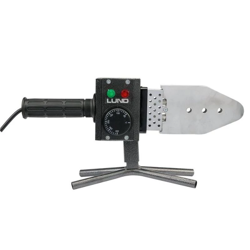 Professzionális polifúziós hegesztő műanyag (víz-, fűtés-) vezetékek gyors és megbízható összeforrasztásához. Állítható teljesítmény és hőmérséklet (0–800 W / 0–300 °C), tartozékokkal és masszív fémdobozzal a rendezett tároláshoz.