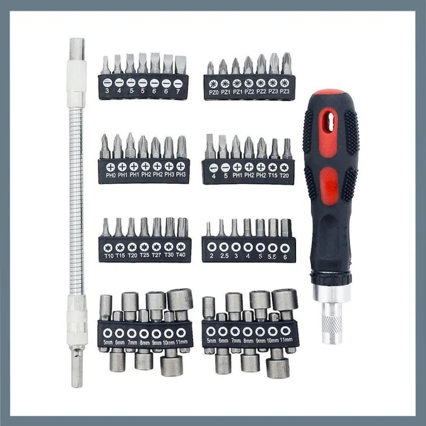 Praktikus racsnis csavarhúzókészlet, amely rugalmas hosszabbítóval és számos különféle bitfejjel van ellátva. A leggyakrabban használt bitekből több darab is megtalálható a csomagban.