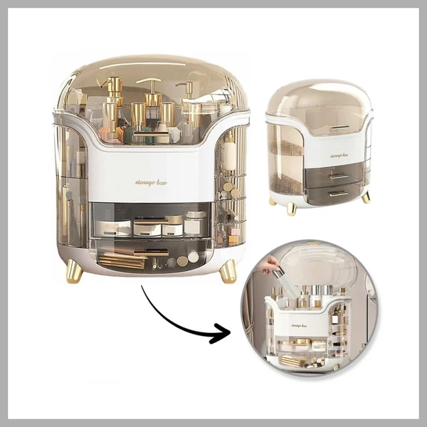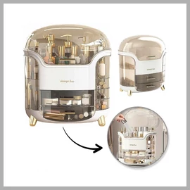 Modern akril anyagból készült, divatos színben, aranyszínű részletekkel, amelyek exkluzív megjelenést kölcsönöznek neki. Az átlátszó fedél segít gyorsan megtalálni a keresett kozmetikumot.