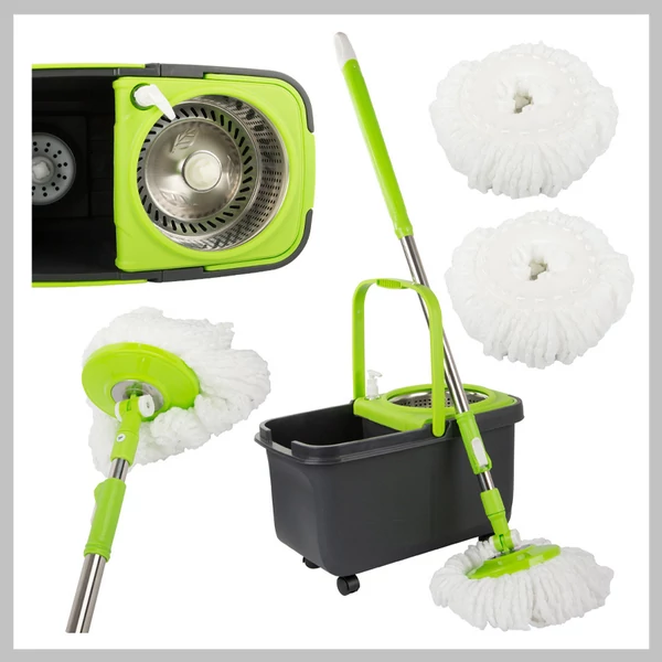 Rotációs felmosó 360°, vödör adagoló, 2x mikroszálas alátét készlet Műszaki adatok: Termékkód: 27078 Kiváló minőségű anyagokból Könnyű és kézreálló Kevés helyet foglal Kényelmes használat Centrifugális rendszere tökéletesen kimosja a felmosót és elvezeti a vizet Jobb összegyűjti a szennyeződéseket Állítható 90°-os rúddal rendelkezik, amely lehetővé teszi a nehezen hozzáférhető helyeken történő mosást Tökéletes minden padló, üvegfelület és autó mosásához Nagyon nedvszívó betétek mikroszálas, amely mosógépben mosható Fröccsenés elleni védelemmel rendelkezik Teleszkópos nyéllel Összecsukható szerkezet Méretek: Vödör méretei: 47cm x 26cm x 29cm Rúdhossz: 94cm-126cm Alap átmérő: 16cm A készlet tartalma: Forgófejes acél felmosó Vödör kerekekkel mosómechanizmussal és forgó 2 tartozékkal mikroszálas Folyadék adagoló