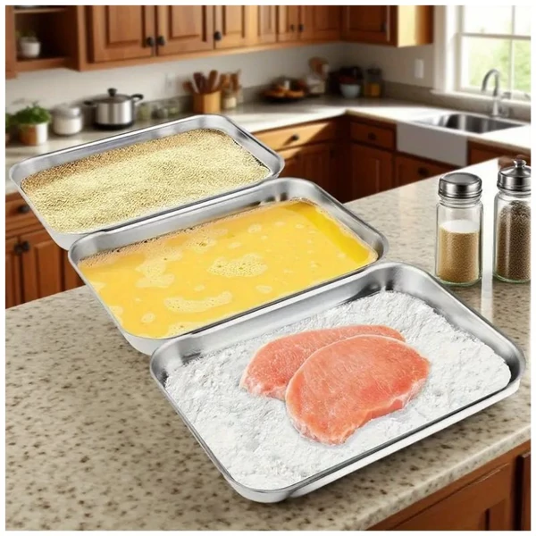Ez a praktikus rozsdamentes acél tálca szett ideális panírozáshoz és előkészítő konyhai munkákhoz. A különböző méretű tálcák segítségével könnyen elrendezhető a liszt, tojás és zsemlemorzsa, így gyorsabbá és tisztábbá válik a panírozás folyamata.