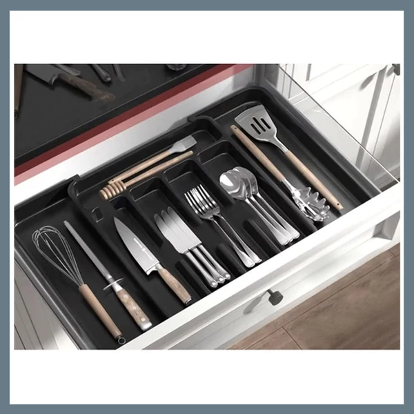 Állítható méret: A csúszó mechanizmus lehetővé teszi, hogy a rendszerezőt a fiók belső méretéhez igazítsd, így minden típusú konyhai fiókban könnyedén használható.