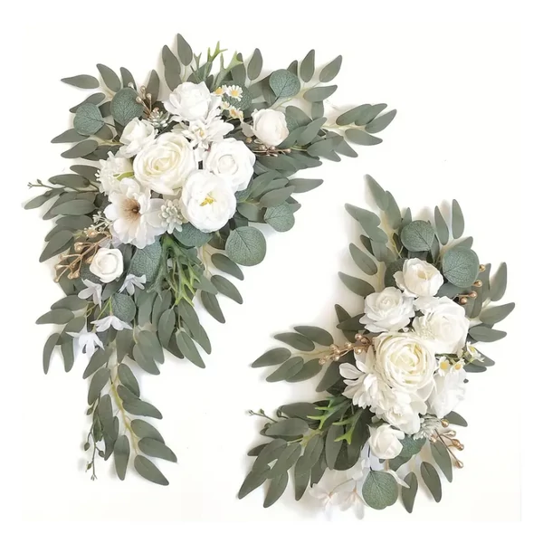 Elegáns és természetes hatású selyemvirág dekorációs szett, amely két darabból áll – egy nagyobb (65 cm) és egy kisebb (50 cm) elrendezésből. A kompozíció fehér rózsákból, apró virágokból és gazdag zöld lombozatból áll, melyek együtt harmonikus, romantikus megjelenést kölcsönöznek bármely térnek.