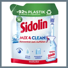 A Sidolin Mix & Clean Cristal koncentrátum praktikus és fenntartható megoldás az üveg- és ablaktisztításban. A koncentrátum vízzel hígítva biztosítja a jól ismert Sidolin minőséget, csíkmentes tisztasággal. Egy tasak tartalma elegendő egy teljes 500 ml-es flakon újratöltéséhez, miközben 92%-kal kevesebb műanyagot használ, mint egy hagyományos palack.