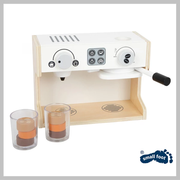 A mini baristák vigyázzanak! Ez az okos, professzionális fa kávéfőző garantáltan tökéletes kávét készít a gyermekkonyhában. Két kattogó hanggal ellátott forgatható gomb és egy mozgatható portafilter, amelyek aktiválva továbbítják a "kávét" az átlátszó kávésbögrébe, és ezzel valósághű játékélményt nyújtanak. Különböző kávékülönlegességek is elkészíthetők! A hátlapon írható tábla és magyarázat található a különféle kávéfajtákról. Egy modern kávéfőző, tejföltővel, amely figyelemfelkeltő és tökéletes kiegészítője a játékkonyhának! Igyon kávét, mint anya és apa! A portafilter gép nemcsak az aktív szerepjátékot segíti elő, hanem a motoros készségeket is. A kávéfőzővel a gyerekek újra előadhatják szüleik mindennapi rituáléit, és közben elsajátíthatják a szociális készségeket. A reggeli kávé következő generációját garantáltan a fiatalok készítik!
