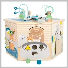 Ez a 8 játszható oldalú tevékenységkocka hosszan tartó játékélményt kínál, és ismereteket ad arról, hogy milyen az élet a háziállatokkal! A gyerekek a vonalvezető csúszókorongos labirintuson, a formakereső játékon, a forgatható párkereső lapkákon és a levehető fűzőcskés színválogató játékon fejlesztik motoros készségeiket – mindezt a házi kedvencekkel! A kis kedvencek minden oldalon megjelennek egy-egy hétköznapi tevékenység közben. Az építőjáték csavarokkal és szerszámokkal segíti a kézügyesség fejlesztését, a csengő/kapuretesz pedig akusztikus stimulációt biztosít. A csúcspont a megfordítható fedél egy szerszám nélkül felszerelhető palatáblával, amely egy íróasztalt ábrázol. A beforgatható felső lapon golyóvezető drótpályás labirintusok, vonatsínek, autópályák találhatók. Tipp: a fedőlap padlón való játékhoz is használható, ha levesszük a játékról, ha pedig beforgatjuk a kocka testébe, akkor kis asztalka válik belőle.