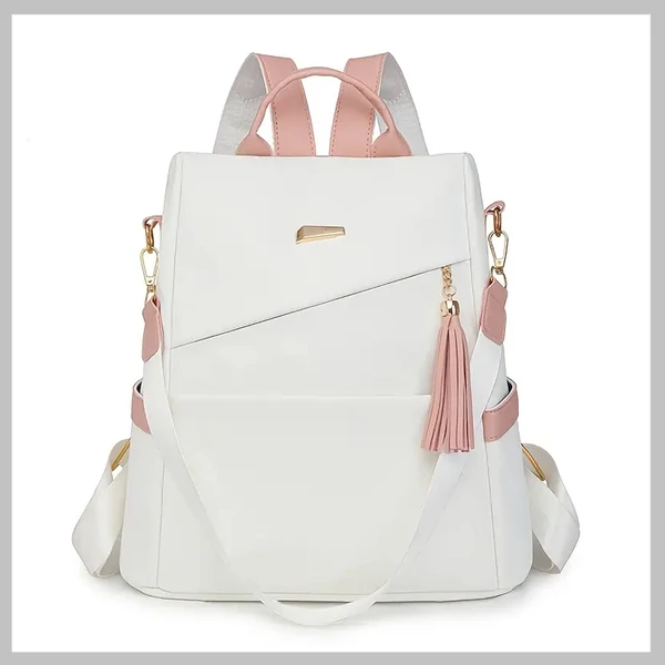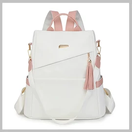 Stílusos dizájn: Fehér alapú, rózsaszín akcentusokkal díszített hátizsák, modern és elegáns megjelenéssel, tökéletes választás utazáshoz vagy mindennapi használatra.