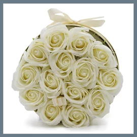 Szappanvirág ajándékcsokor - 14 krém színű rózsa - kerek dobozban GSFB-09
