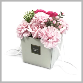 Gyönyörűen prezentált Rózsa és Szegfű Szappanvirág Csokor, tökéletes kis ajándék, hogy jobbulást kívánj vagy köszönetet mondj, ideális esküvői ajándékként, karácsonyi stocking töltelékként, vagy egyszerűen egy kis kényeztetés magadnak.
