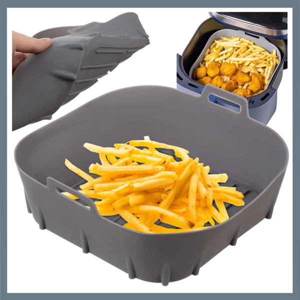 Ez a szürke színű, 20 × 20 cm méretű szilikon sütőbetét ideális választás mindenki számára, aki egészségesebben és kényelmesebben szeretne főzni Air Fryer készülékben. Újrafelhasználható, könnyen tisztítható és környezetbarát megoldás, amely hosszú távon is megkönnyíti a sütést.