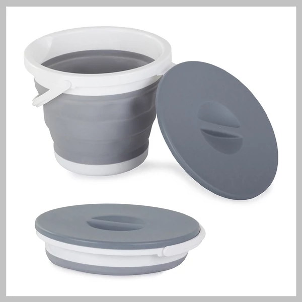 Az összecsukható tetős vödör szenzációs elem, amely minden otthonban hasznos. Tartós és vastag szilikonból , alja és teteje pedig erős műanyagból készült .