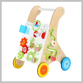Tanulj meg járni játék közben! Igazán szellő ez a fából készült babacipő aranyos, színes részletekkel! A csendes görgőkön a stabil, minden szempontból sok mindent felfedezhet a fedélzeten! A kis állatokat és virágokat át lehet tolni a labirintusban, a baglyokat és a fogaskerekeket el lehet forgatni, sőt egy mozgó kezű tanulási óra és egy tükör is benne van! Az aranyos motívumok és az élénk színek jó hangulatba hoznak és felkeltik a felfedezés vágyát. Mindenre gondolt: A csendes gumikötésű hengerek megakadályozzák a kocsi oldalirányú megcsúszását. Tehát a kicsik önállóan tehetik meg első lépéseiket - és nagyon szórakoztatóan élhetik meg a színes babasétáltatót!