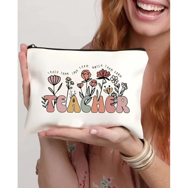 Ez a stílusos és személyes neszesszer tökéletes ajándék tanároknak évzáróra, pedagógusnapra vagy bármilyen alkalomra. A puha, fehér alapú táska elején színes, virágos grafikával díszített „TEACHER” felirat található, felette inspiráló szöveg: „Teach them. Love them. Watch them grow.”