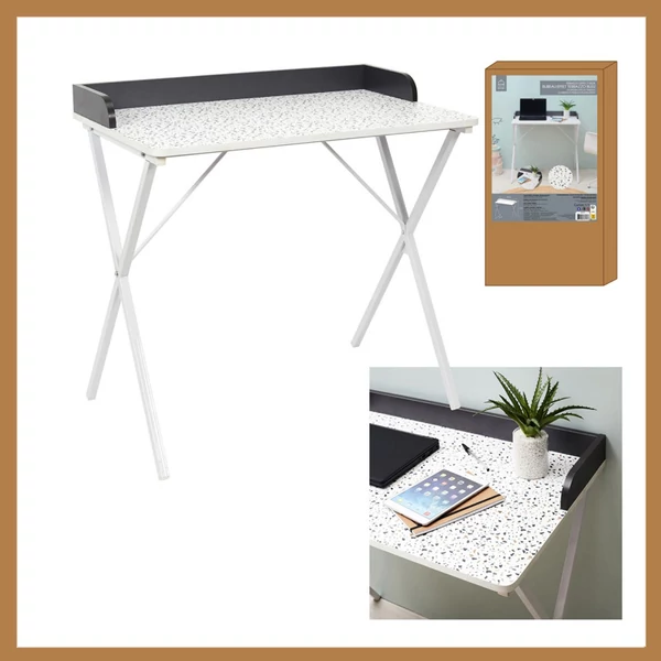 Ez a kompakt íróasztal nagyszerű és praktikus kialakításának köszönhetően kiváló segítség lesz munkájában vagy tanulmányaiban. Megemelt hátlapja, oldallapjai és a kis elválasztók könyvtámaszként is használhatóak, és megakadályozzák, hogy a tollak vagy az apró tárgyak leessenek, így az asztallap rendezett és tiszta marad. Emellett az íróasztal munkaállomásként vagy másként is szolgálhat.